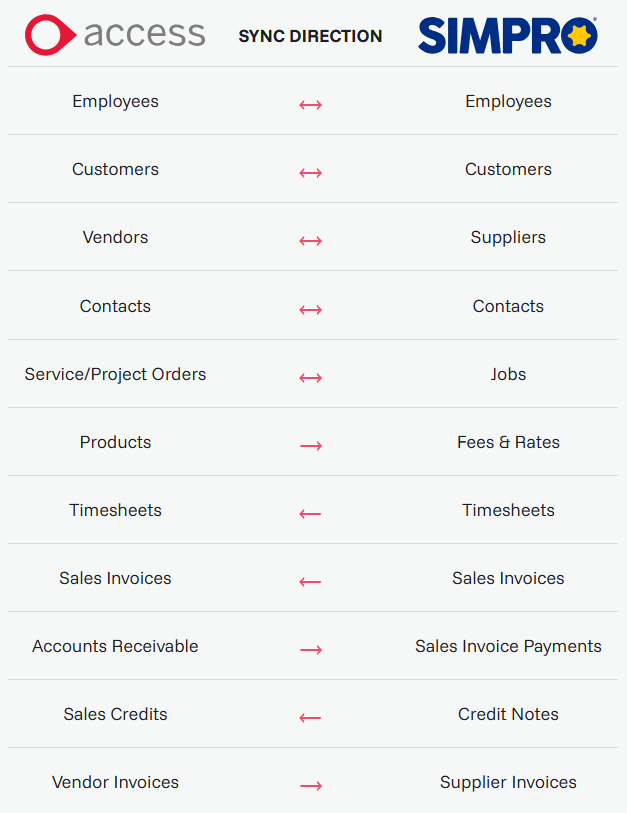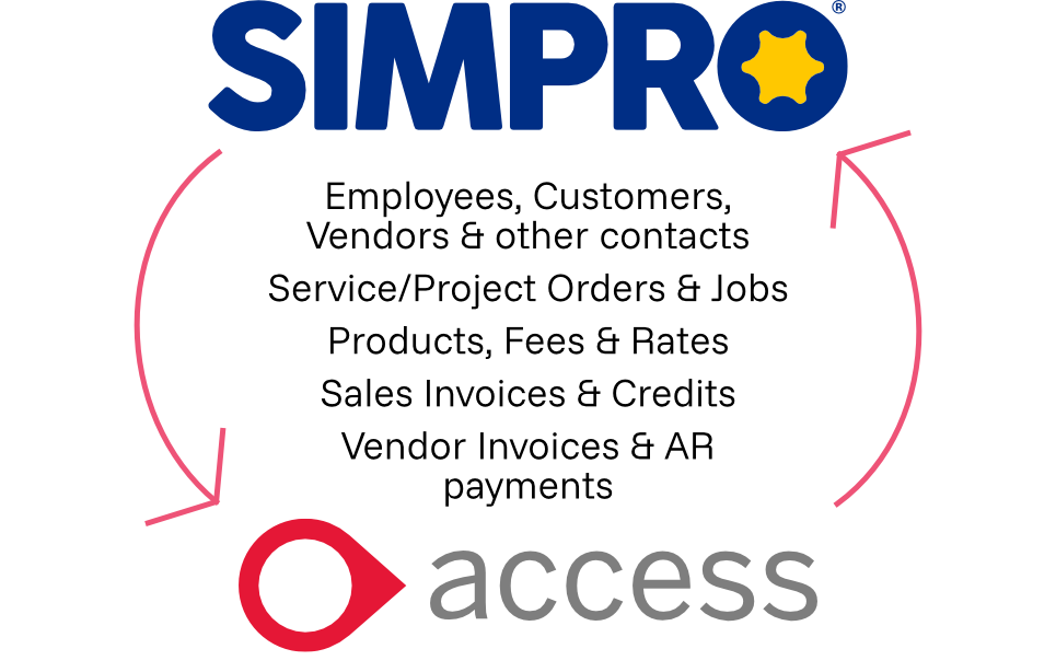 Sales invoices in Simpro are synced to Access Dimensions and updated in Simpro when a connected payment is made.
