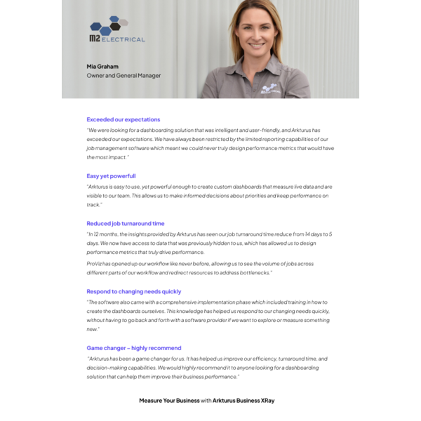 • Connects to Simpro, Xero, and any other system(s) to centralize and automate your reporting