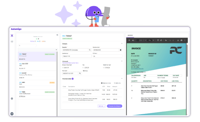 Designed hand-in-hand with Simpro, Autamigo sends Bills through linked POs. It matches received items against the PO, adds new details if needed, and even attaches the original PDF.