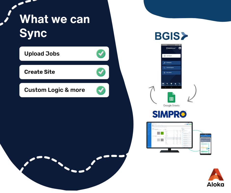 Integrating BGIS with Simpro unlocks seamless data transfer and synchronized workflow management for facility and asset operations. Through Aloka Integration Hub, job data can be uploaded from Simpro to BGIS for centralized project oversight, while new sites can be created instantly as jobs are approved. Workflow automation and custom logic support advanced use cases, helping facilities teams reduce downtime and compliance risk while boosting efficiency and transparency.