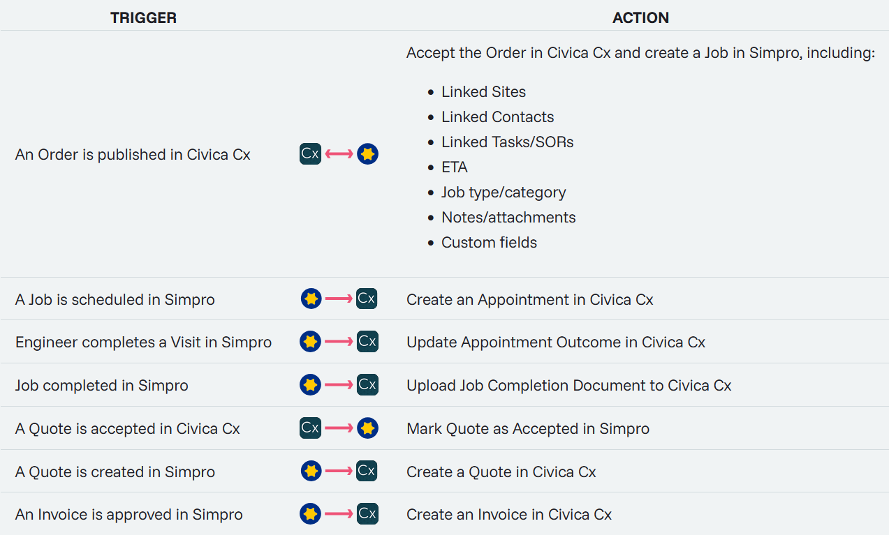 We count a job as the moment your integration takes an Order in Civica Cx and creates a corresponding Job in Simpro. Your integration handles every step of the job from quoting through to completion.