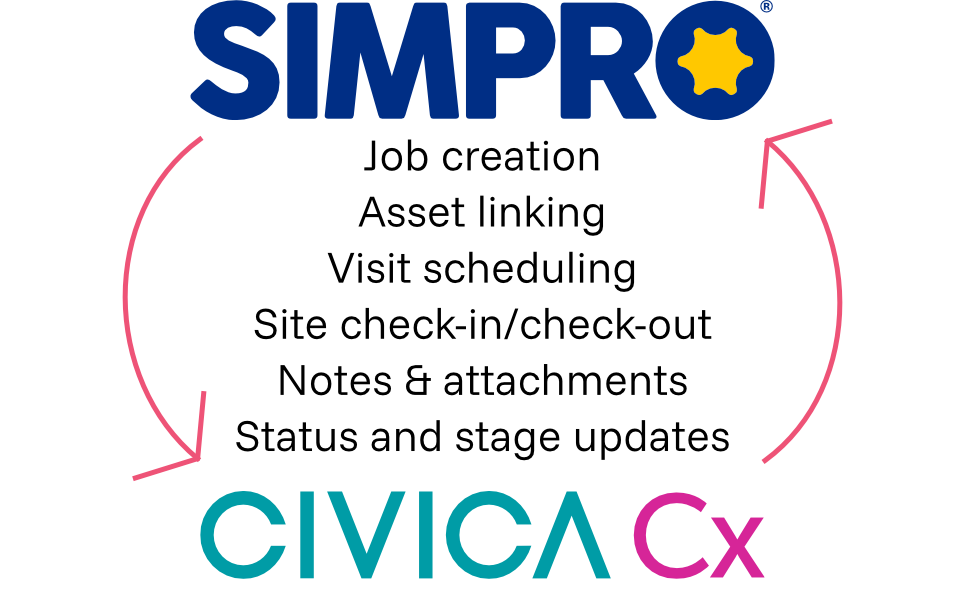 Sync jobs between Simpro and Civica Cx with a comprehensive and configurable two-way software integration. Stop wasting time double-keying the same info into two systems and deliver instantaneous updates to your clients.