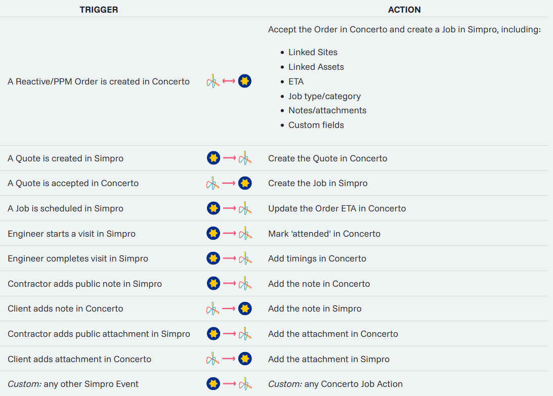 NOTE This is a complex, customised integration requiring a managed setup and implementation. Implementation fees may apply. Concerto may also apply a charge for API access in addition to the integration costs.