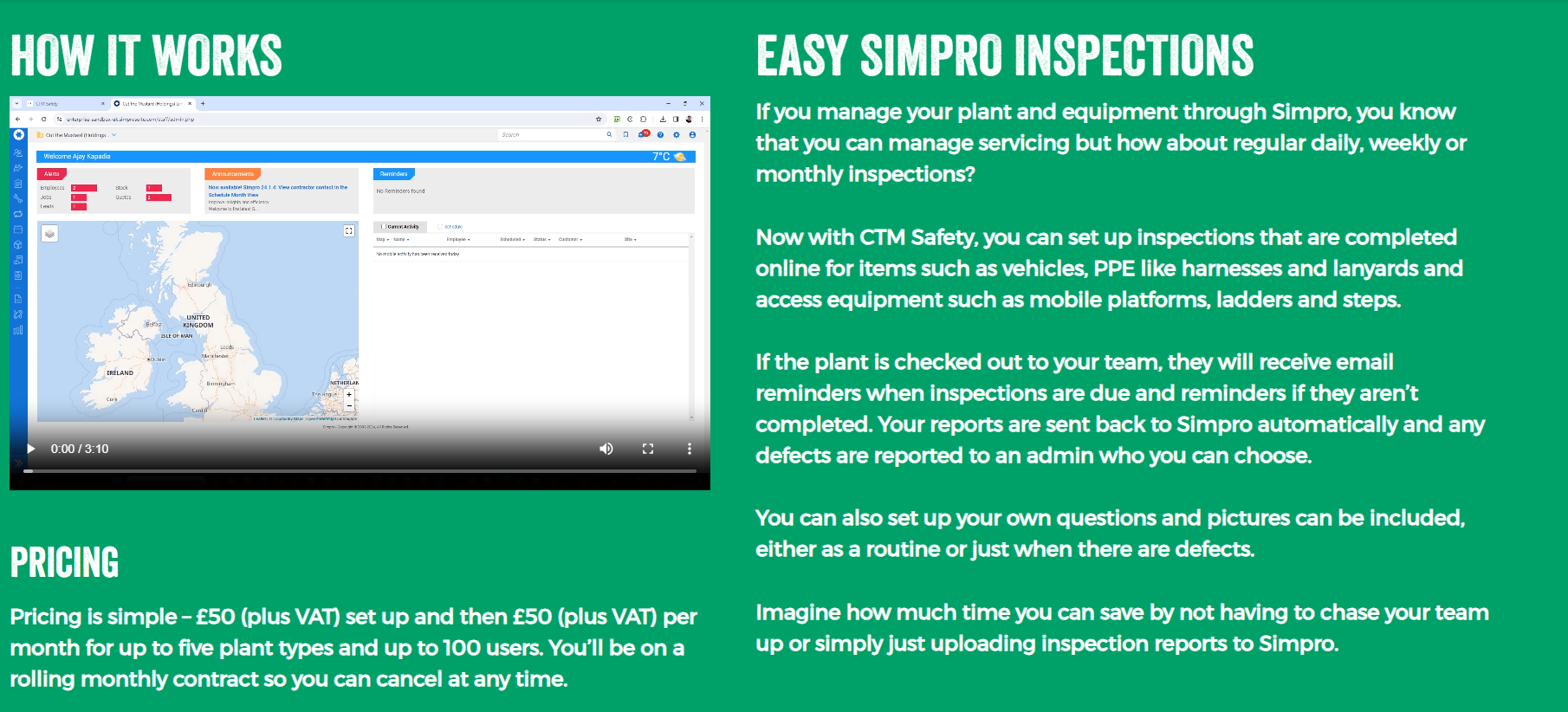 If you need regular inspections of your Simpro Plant & Equipment then check out CTM Safety. We automatically remind users about inspections on only notify admins if they are not done or there is an issue. Completed inspections are automatically filed under the item in Simpro.