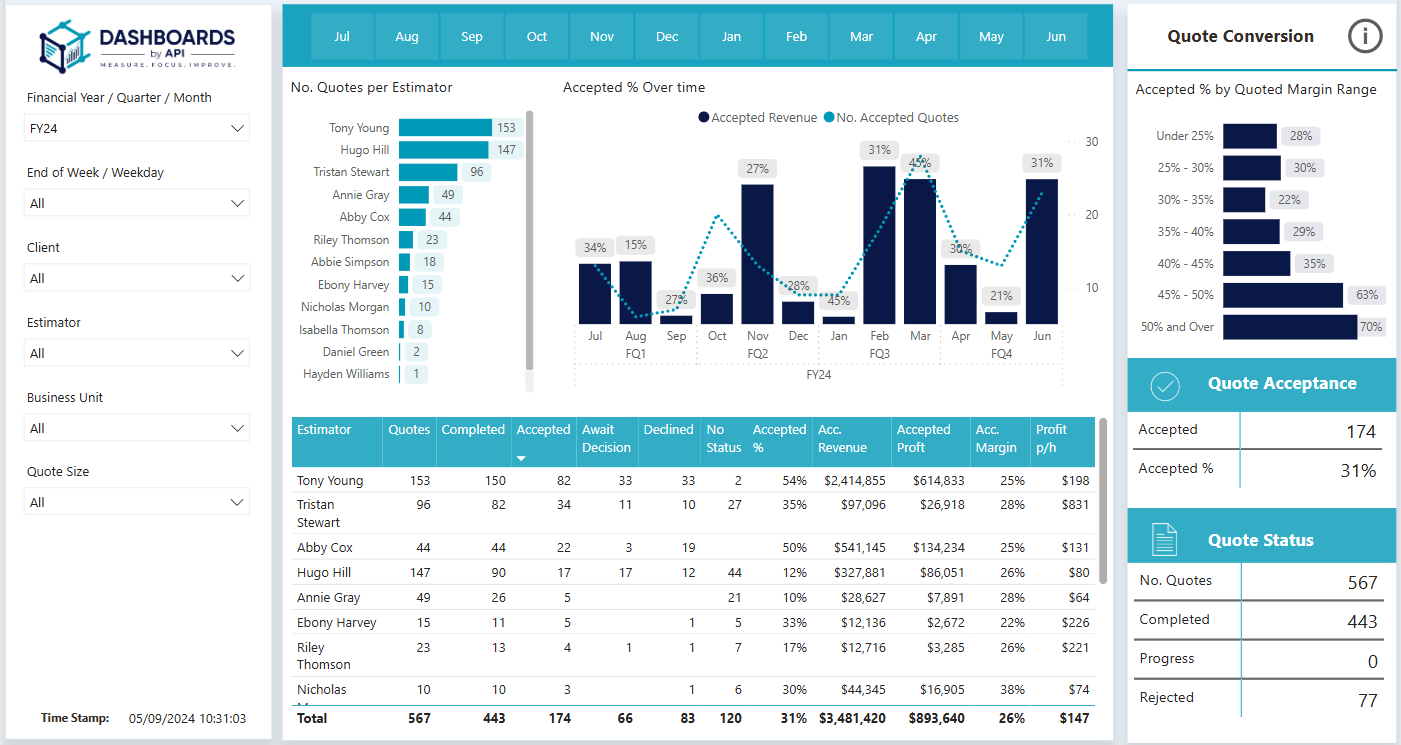 Tracks how often quotes are accepted over time, grouped by estimator and revenue range. This helps you see who's closing the most deals and if your pricing is right, so you can improve your win rates and plan better. -