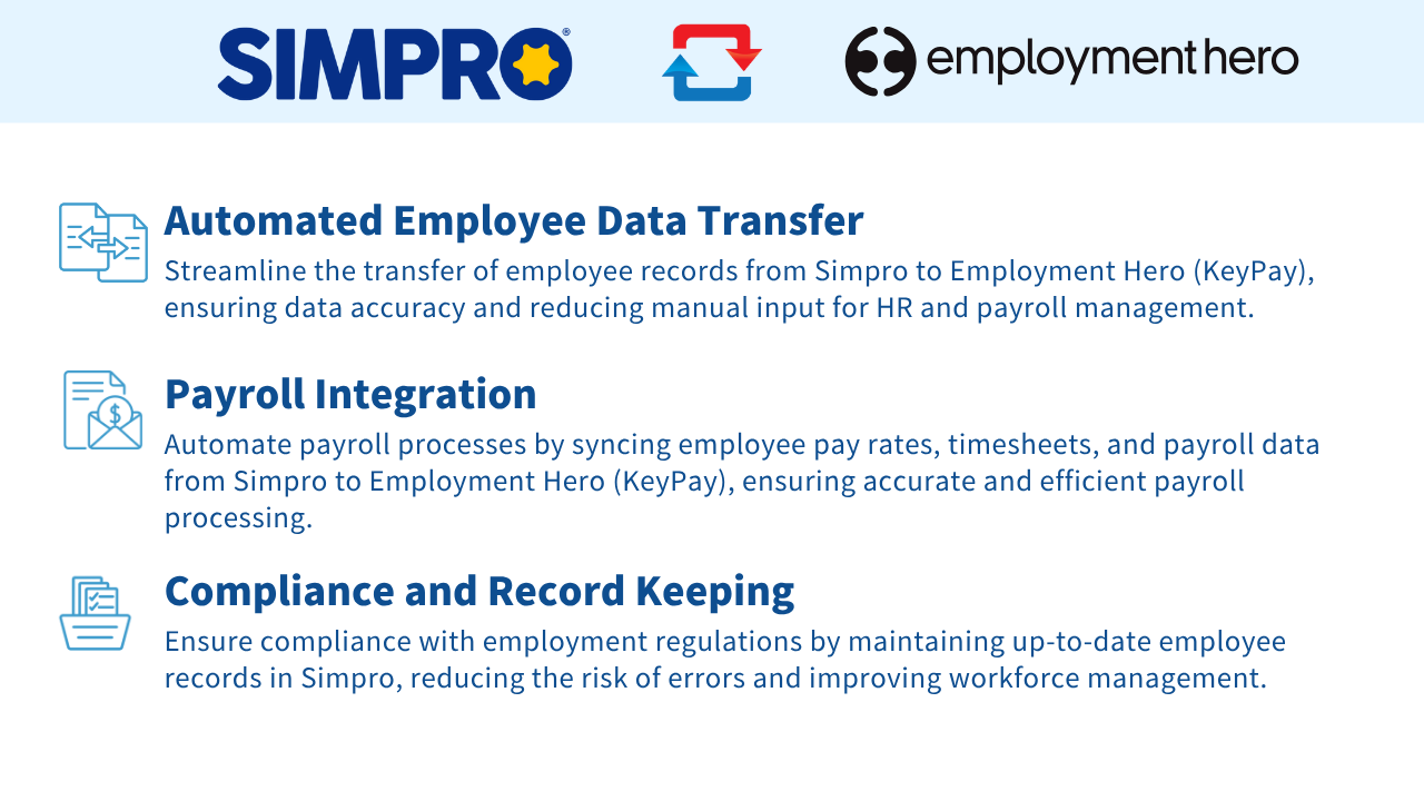 Streamline the transfer of employee records from Simpro to Employment Hero (KeyPay), ensuring data accuracy and reducing manual input for HR and payroll management.