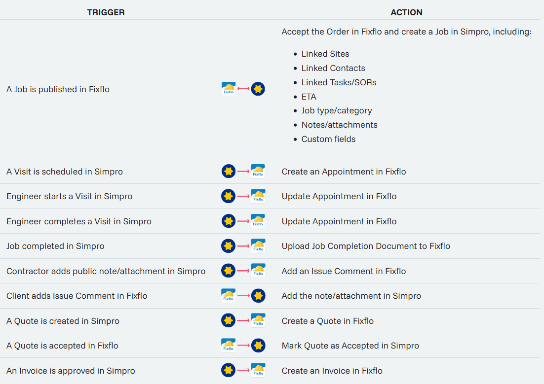 NOTE This is a complex, customised integration requiring a managed setup and implementation. Implementation fees may apply. Fixflo may also apply a charge for API access in addition to the integration costs.