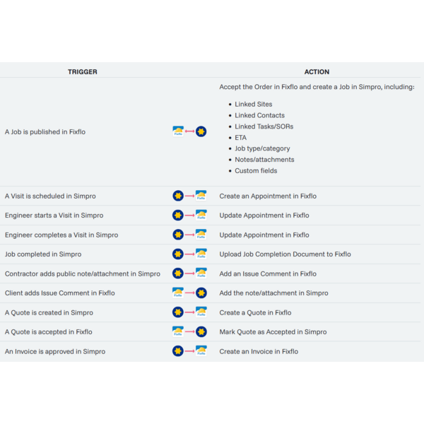 NOTE This is a complex, customised integration requiring a managed setup and implementation. Implementation fees may apply. Fixflo may also apply a charge for API access in addition to the integration costs.