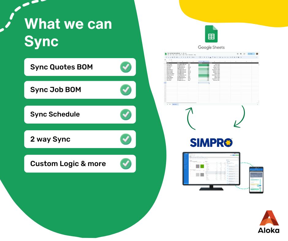 Integrating Google Sheets with Simpro delivers seamless two-way data sync for quoting, job management, scheduling, and reporting. Aloka Integration Hub synchronizes quotes and job bills of materials (BOMs) between Simpro and Google Sheets, keeping pricing, quantities, and resource plans accurate and accessible without manual entry. Schedules are updated instantly in both platforms, ensuring project teams remain in sync and informed. Alongside real-time data flow, the integration enables robust custom logic for automated calculation, validation, and tailored business workflows.