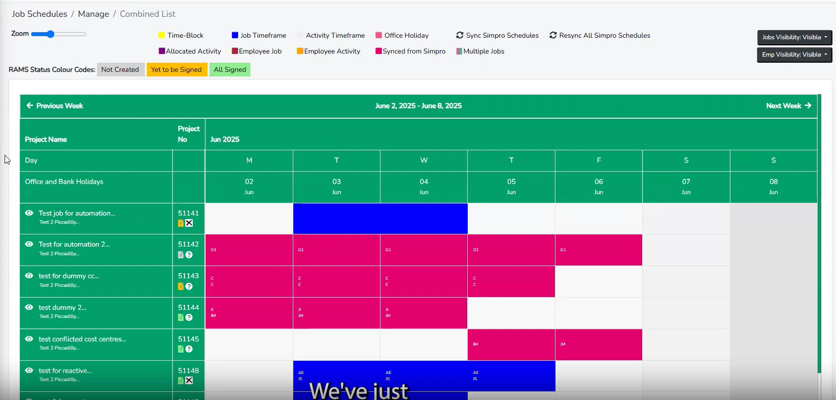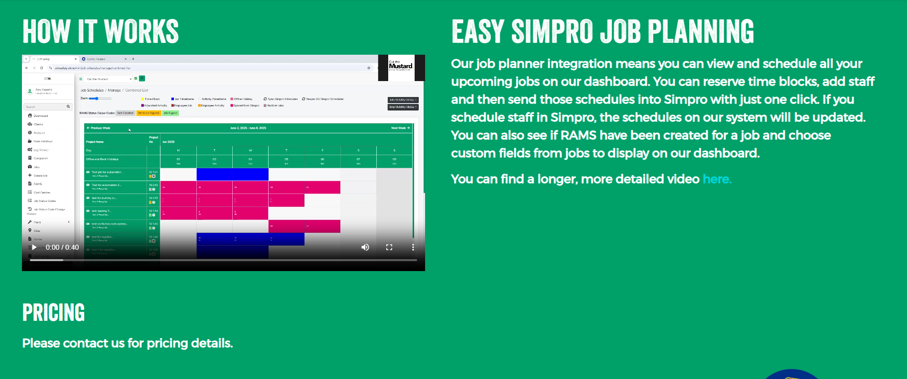 Our job planner integration means you can view and schedule all your upcoming jobs on our dashboard. You can reserve time blocks, add staff and then send those schedules into Simpro with just one click. If you schedule staff in Simpro, the schedules on our system will be updated. You can also see if RAMS have been created for a job and choose custom fields from jobs to display on our dashboard.