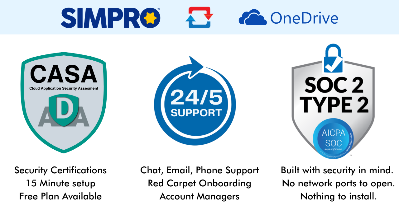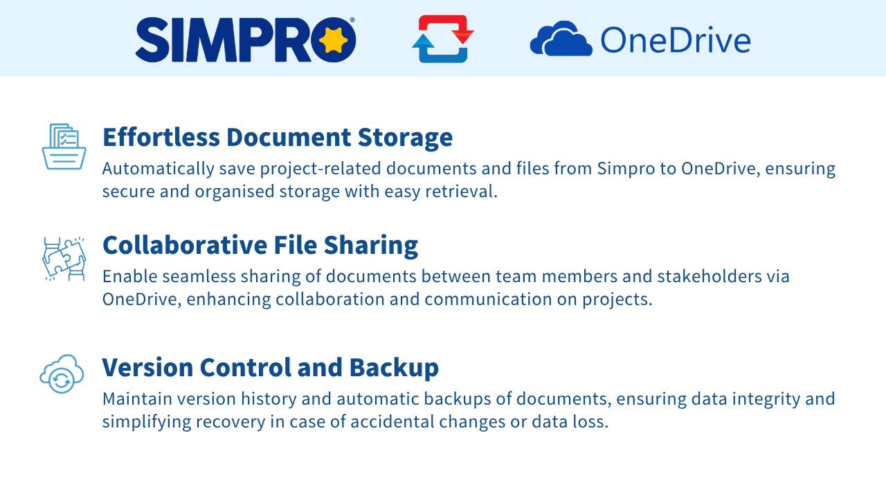 Integrating Simpro with OneDrive enhances document management. It simplifies document uploads to OneDrive, streamlining data access and security, facilitating efficient workflows, and promoting data integrity.