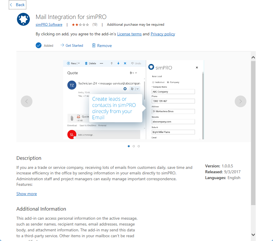 Through the integration between Simpro and Outlook, users can easily create new leads and add customers in Simpro. They can also easily attach emails as notes to customer cards, leads, quotes and jobs without leaving Outlook. Once the integration is installed, Simpro automatically recognizes the email sender in Outlook if their information is saved within the build.