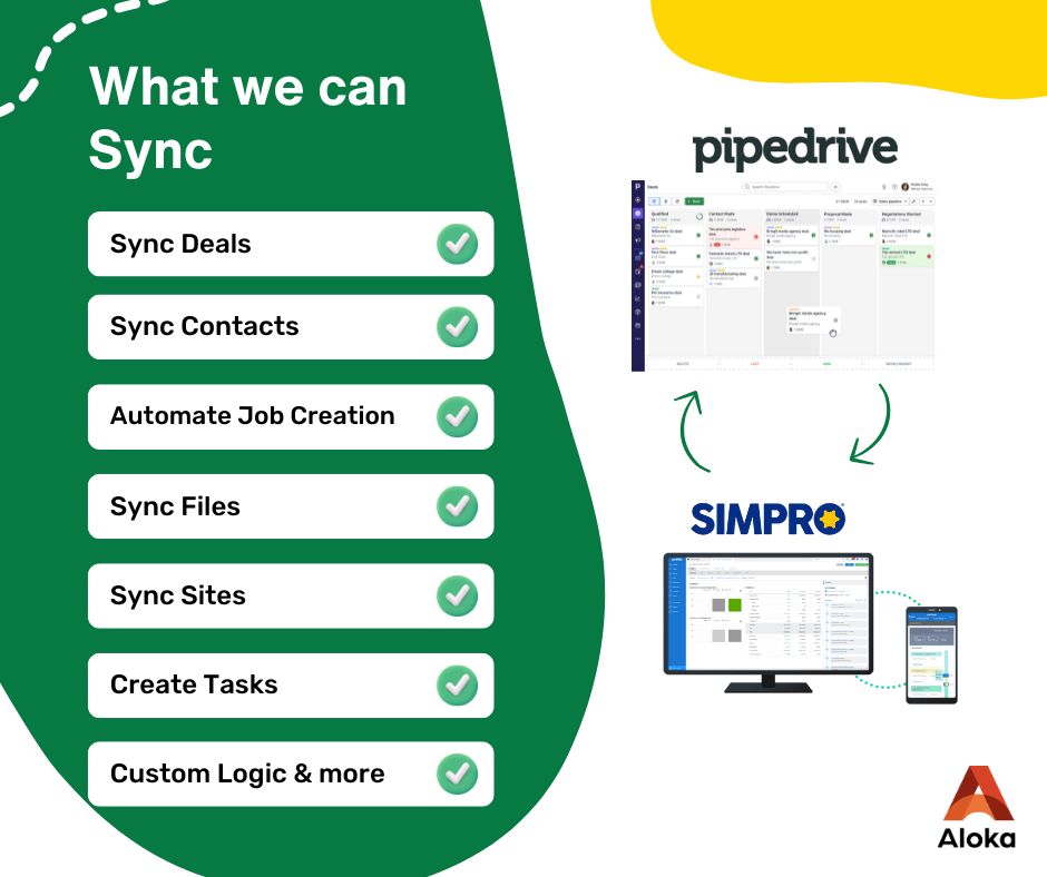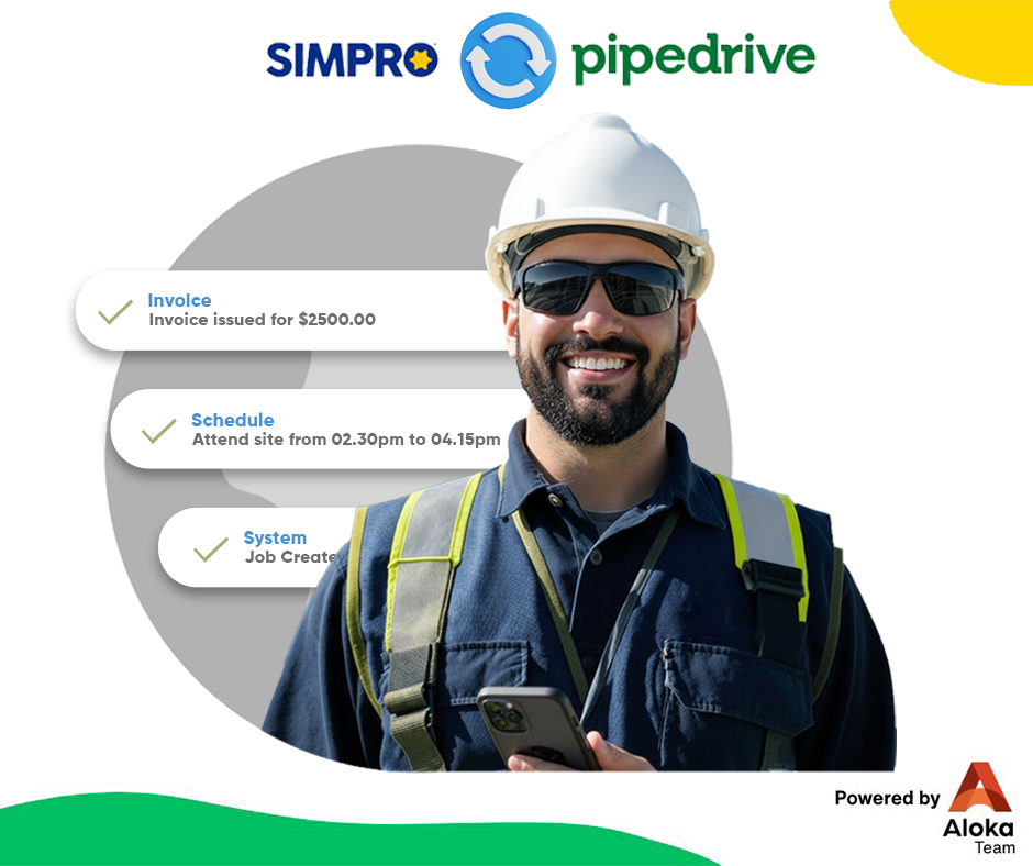 Integrating Pipedrive with Simpro bridges the gap between front-end sales operations and back-end field service management. Using Aloka Integration Hub, businesses can seamlessly connect pipelines, deals, and contacts from Pipedrive to Simpro projects and jobs. This eliminates duplicate data entry, ensuring that won opportunities instantly flow into Simpro for project delivery. Real-time synchronization keeps customer details, sales conversations, and project progress unified across teams, minimizing errors and boosting overall productivity.