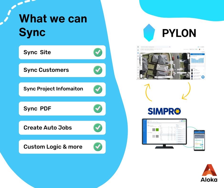 Integrating Pylon with Simpro allows solar installers to connect design and proposal workflows directly with field operations. Using Aloka Integration Hub, customer sites, proposals, and project details from Pylon can be automatically synced with Simpro, enabling a smooth transition from sales and design into delivery and installation. Completed proposals and PDF documentation are instantly attached to the right Simpro job, while automated job creation ensures nothing is missed between customer acceptance and field execution.