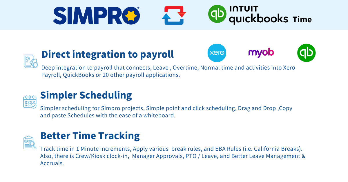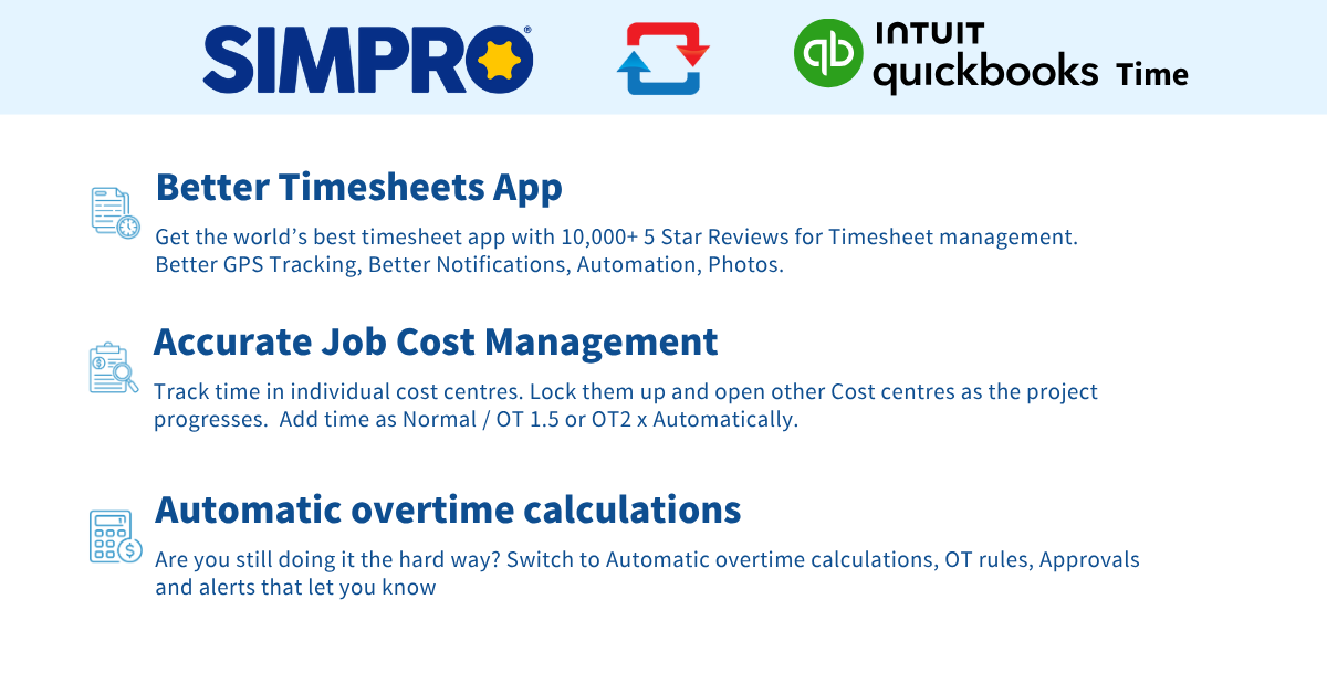 Manage your team, and your Job costing, with transparency and efficiency. Save hours, if not days of admin work by tracking time to the minute against all Jobs, Sections and Cost Centers, and feeding that time directly to Simpro, automatically. GPS Tracking holds your team accountable and ensures every minute is tracked, and charged.
