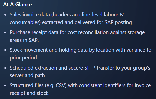 Our SAP Finance Integration extracts sales invoice data, purchase order and receipt information, and stock movement data from Simpro, then delivers it to your SAP environment via secure file transfer (SFTP). Invoice line items—including labour and consumables—are structured so group finance can post to the right nominal codes and cost centres. Stock and purchase data support reconciliation against your chosen storage areas and entities in SAP, so UK operations and group reporting stay in sync.