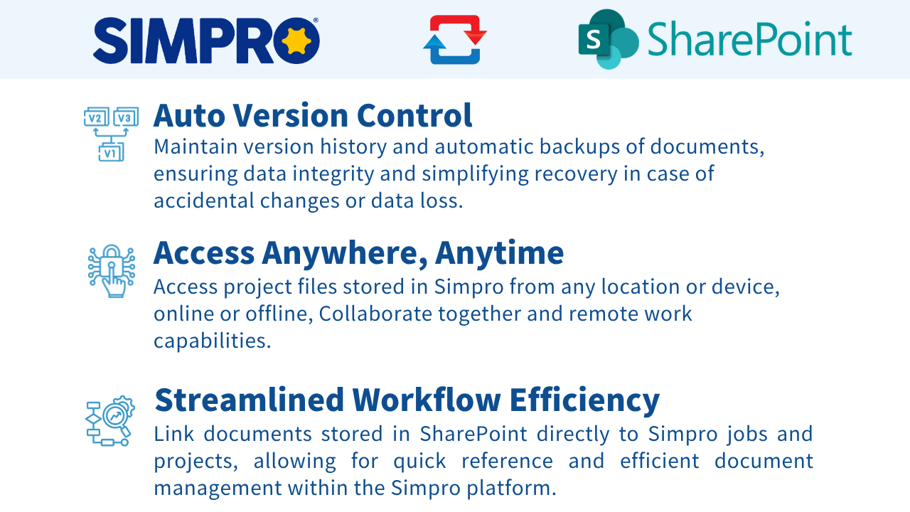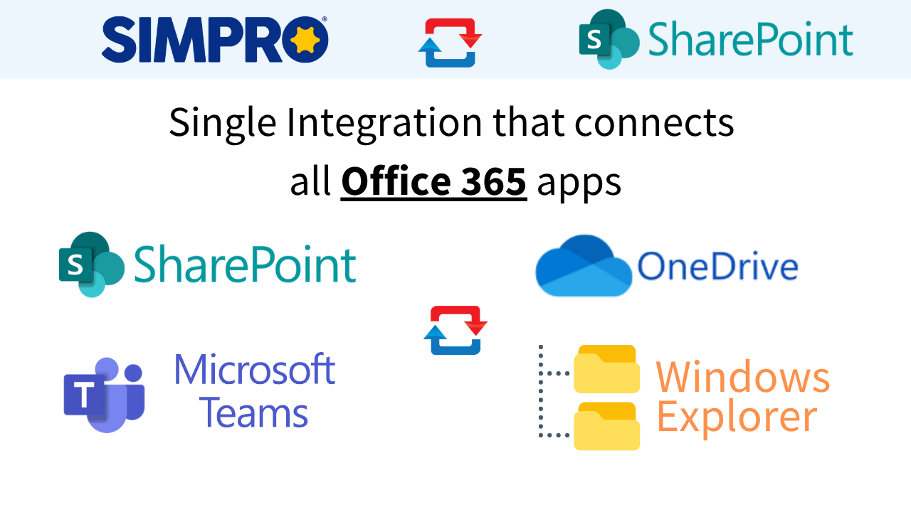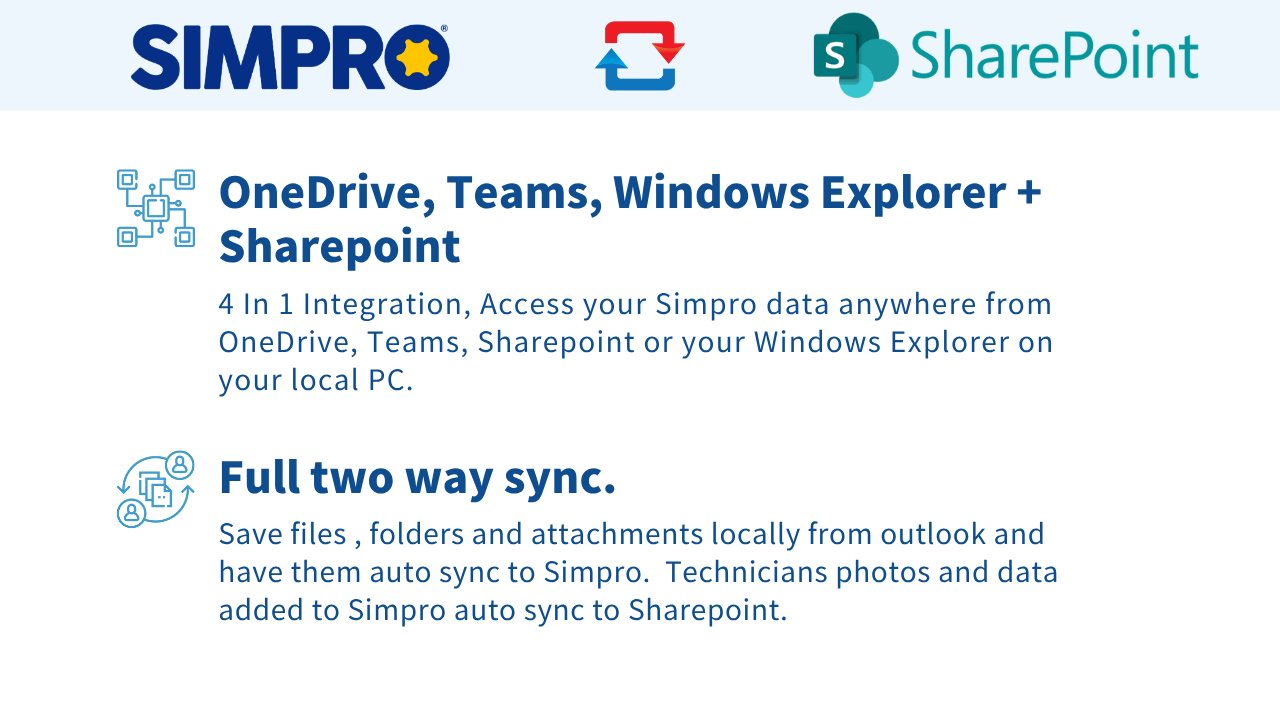 Sync your Simpro data two ways with SharePoint, MS Teams, OneDrive, or your local Windows Explorer folders. Work locally and save into Simpro.