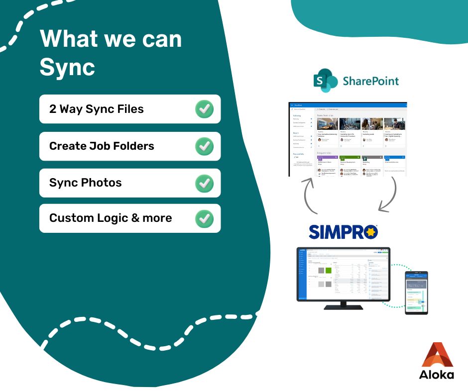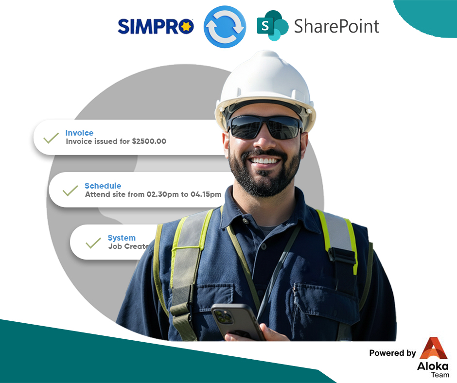 Integrating SharePoint with Simpro brings document management and workflow automation directly to field service operations. The Aloka Integration Hub allows two-way file synchronization between Simpro and SharePoint, ensuring that the latest documents are always accessible and up-to-date for both office and field teams. Automated job folder creation organizes project files for each Simpro job, while photo sync enables easy access and sharing of site images. Customizable logic supports tailored workflows to fit business needs and compliance requirements.