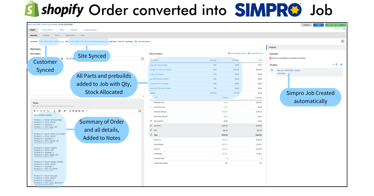 The integration automatically creates a corresponding job in Simpro, including all the necessary details such as order information, customer details, and required services.