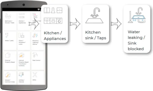 The tenant’s interface provides icon based fault reporting, allowing them to quickly and intuitively select the location, item and fault. It prompts for all the information needed, including photos and creates a task or job with that data in Simpro.