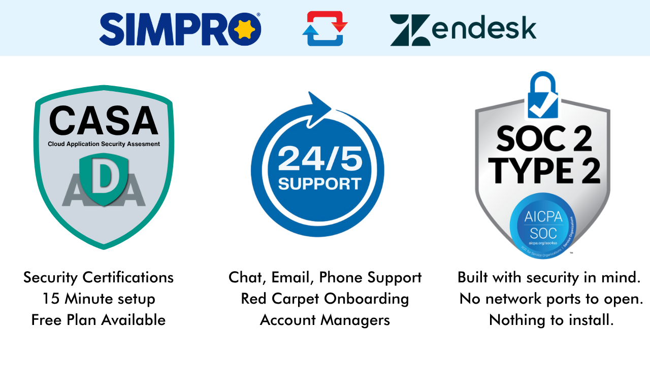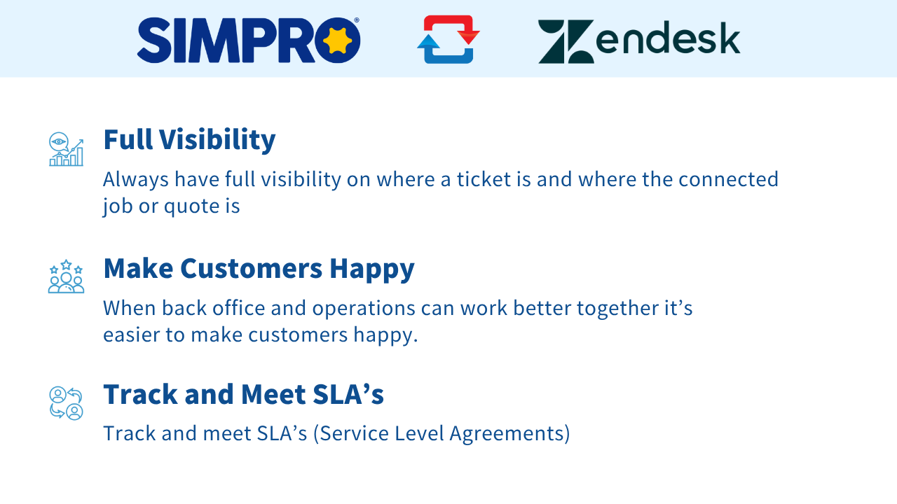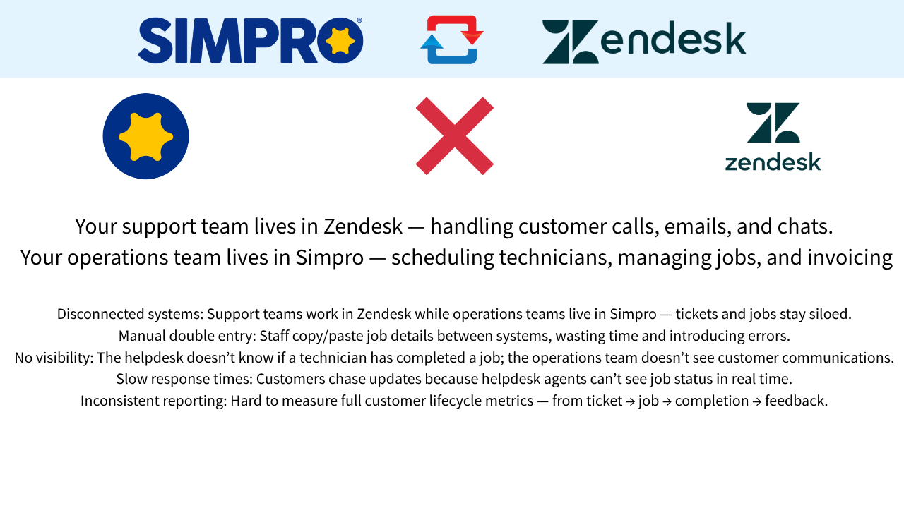 Use Zendesk as the powerful Help desk system to manage the front end communications and use Simpro to manage the operations Back end.