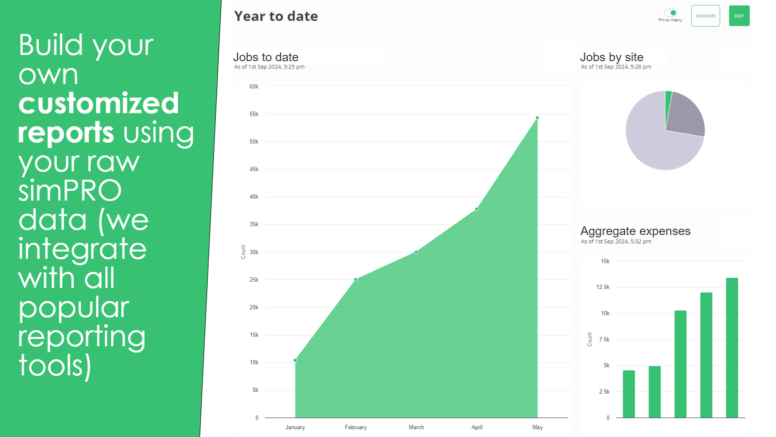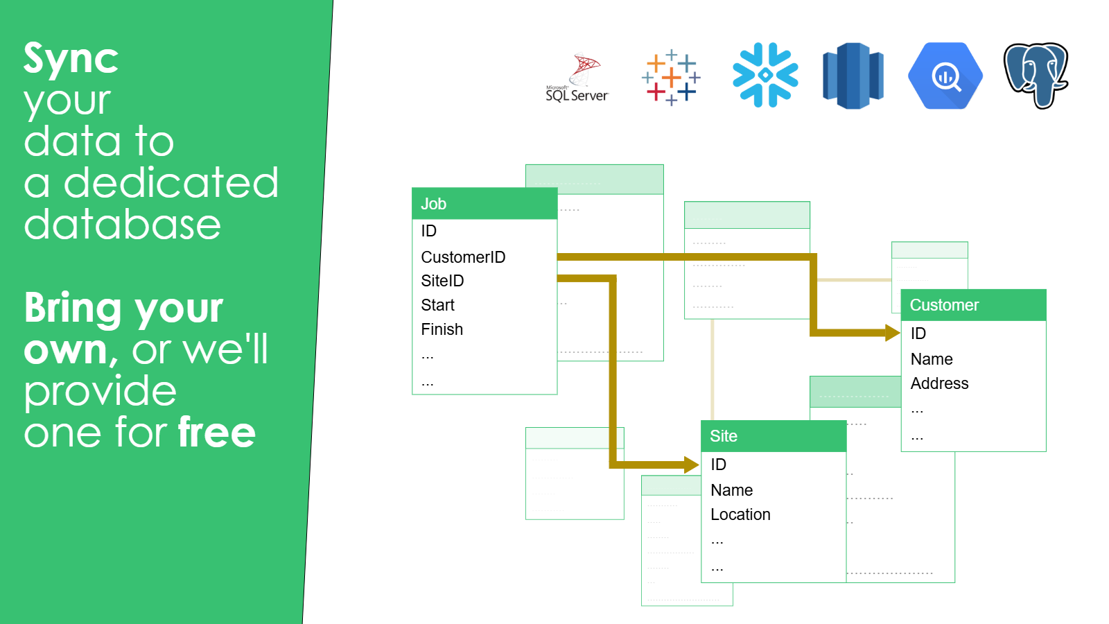 Securely sync your simPRO data to PowerBI, Excel, Looker, Tableau, G-Sheets, Zoho Analytics, Chartio, Domo, Databox, Klipfolio, Postgres, Snowflake, Redshift, SQL Server, BigQuery, Qlik or any other reporting tool you are using.