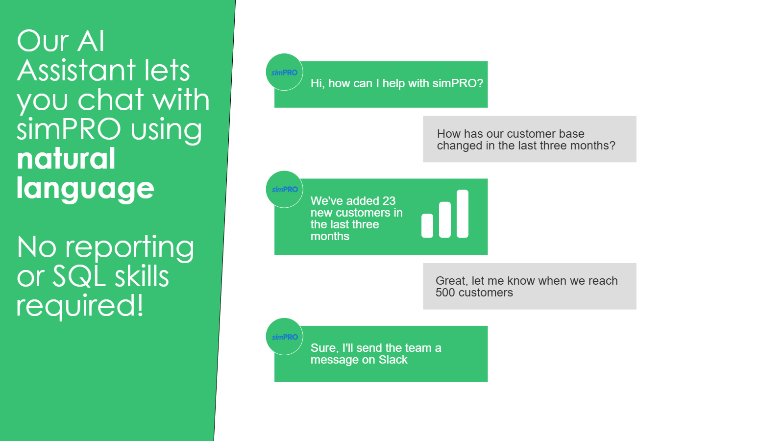No. You can use our built-in AI chatbot to converse with your simPRO data in natural language.