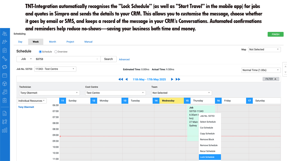 When your staff lock a schedule for a Quote or a Job within Simpro, , this event is recognized by TNT-Integration and details are forwarded to CRM where your own automation is processed. This can be used to send details to the contact by SMS or email or notify internal staff who can then call the client directly if required.