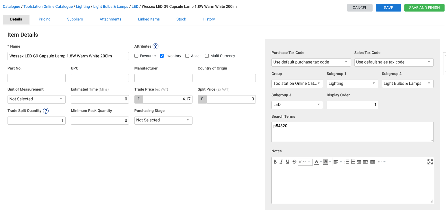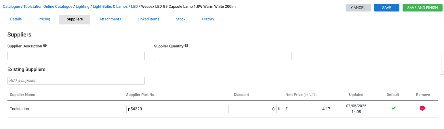 Our integration does all the hard work creating new catalogue items, adding Toolstation as a supplier and filling in the details — part name, five-digit code, trade price, and net price.