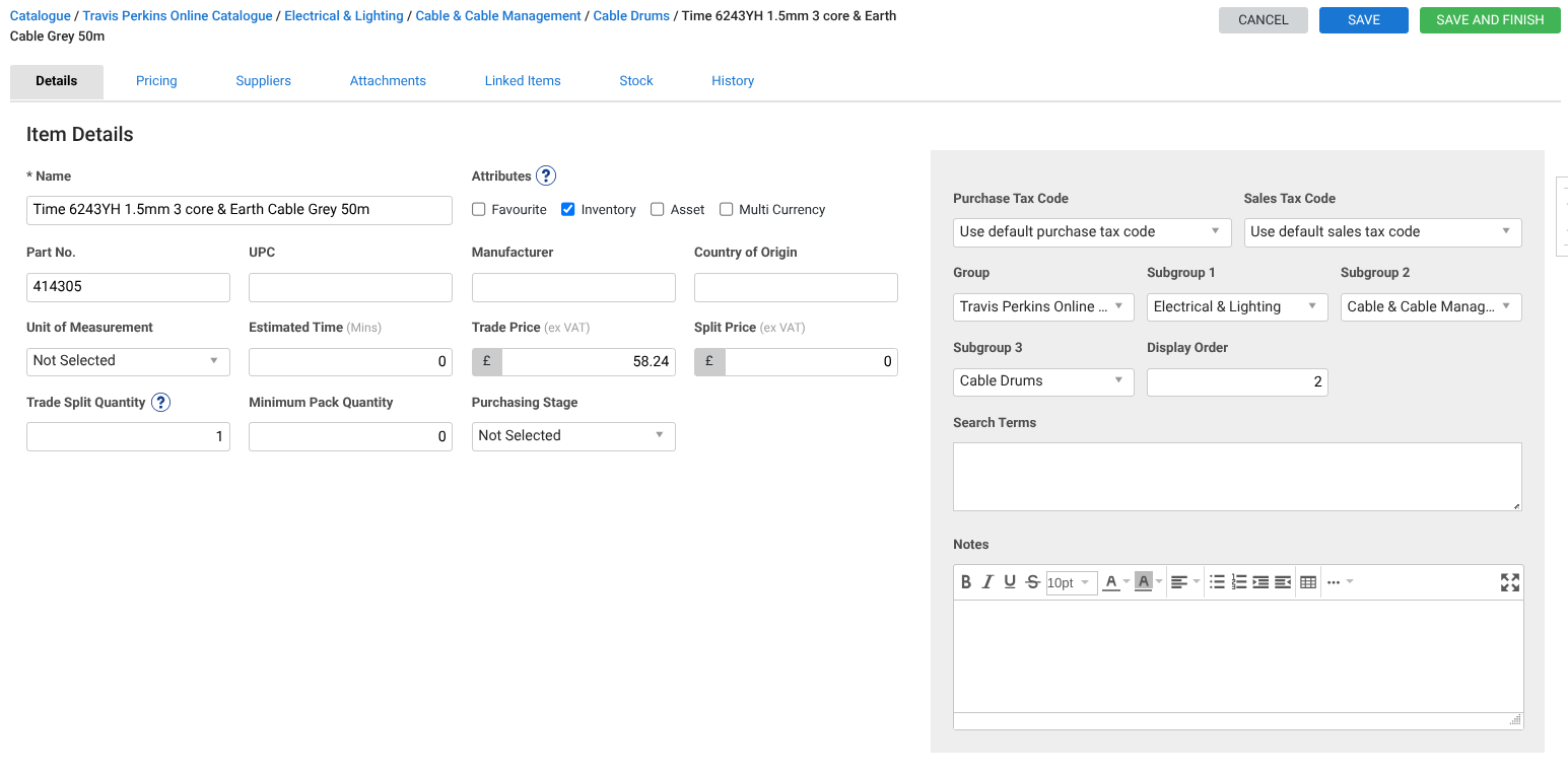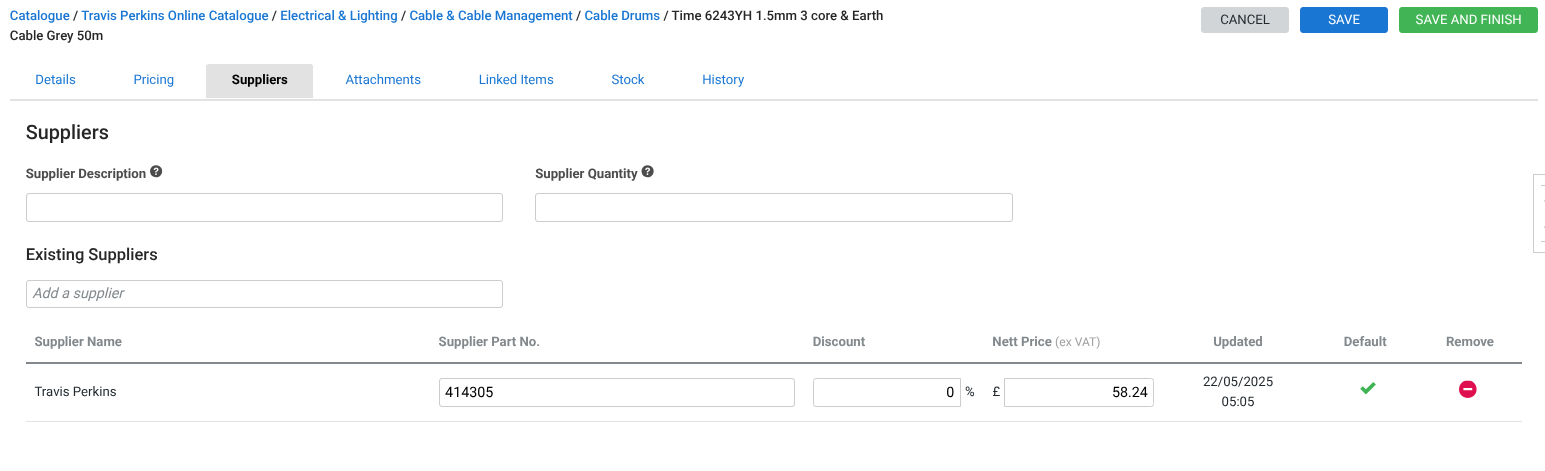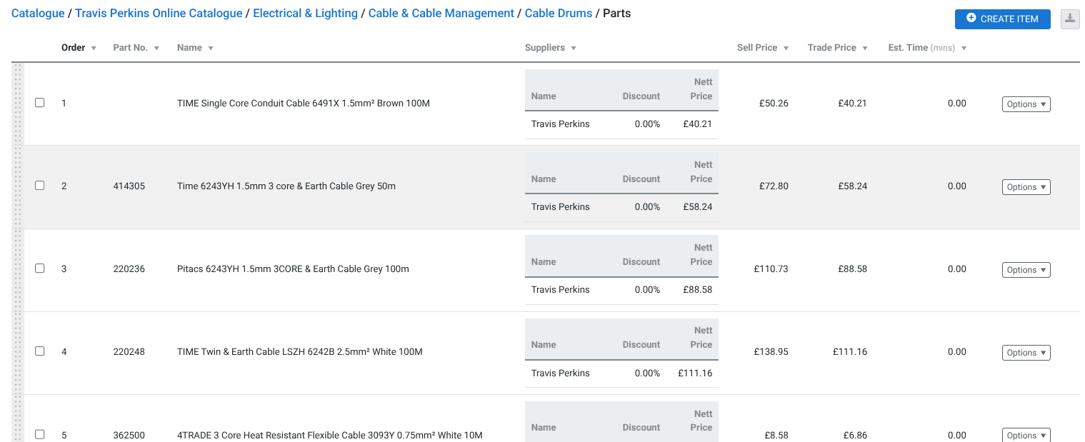 Our integration does all the hard work creating new catalogue items, adding Travis Perkins as a supplier and filling in the details — part name, five-digit code, trade price, and net price.
