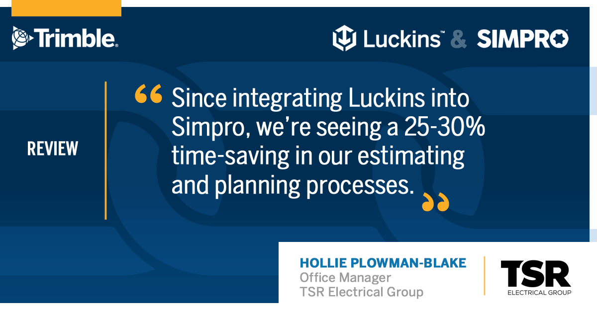 Detailed product information that is comprehensive and flows throughout the tool to estimates and POs can save ambiguity, manual errors and time spent on order queries. Trimble Luckins ensures the data runs through the Simpro tool in a cohesive and standardised way. Our information, marked by the industry default TSI code, is used by 86% of UK wholesaler branches so it is easily cross-referenced and supplied to close the loop.
